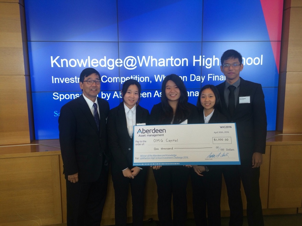 How do you measure the success of financial education for high school students? Get some 80 freshmen, sophomores, juniors and seniors from around the world into a high-tech conference room atop Wharton’s Huntsman Hall, and let their financial knowledge and conviction lead the way. Knowledge@Wharton High School and Aberdeen Asset Management, a global asset management company with U.S. headquarters in Philadelphia, did just that on Saturday, April 30 – also the final day of Financial Literacy Month in the U.S. — during our fourth-annual Investment Competition Wharton Day Finale. They welcomed more than 130 invited high school students, educators, parents and financial professionals to participate in the presentation, observation and evaluation of the 16 finalist teams from this year’s 2015-2016 KWHS Investment Competition, sponsored by Aberdeen. Fifteen student teams competed the day of the Wharton Finale event (and one via conference call during the prior week) by presenting their final investment strategies to a panel of four Aberdeen judges. A total of 13 teams traveled to Wharton to present live, while two teams presented remotely via Skype. Among the live presenters were the top three Indian teams from the KWHS South Asia and Middle East regional competition. The finalists were selected from a group of more than 200 teams that submitted investment policies in January and March. Those final written policies were the culmination of 10 weeks of learning investing concepts, developing strategies in teams of four to nine students, placing online trades through Wharton’s OTIS platform, and thinking critically and creatively. OMG Capital, a team of four students from Moanalua High School in Honolulu, Hawaii, won the second-place prize of $1,000.